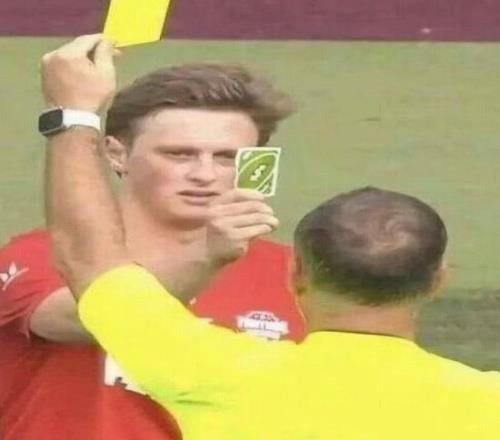 这张梗图的来源是2023年的一场明星网红慈善赛,知名网红Max Fosh因被抓到犯规,让前英超裁判克拉滕伯格亮出一张黄牌警告,但Fosh出示了绿色反转卡,引得现场大笑。
