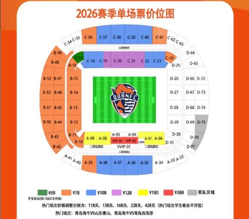 相比较2025赛季,新赛季青岛海牛主场散客的单场球票(2场热门场次除外),从4个档次细分为6个档次,并且专门设置了学生看台,票价为59元,设置在C17区,C17区上赛季的票价为120元。在拥有专业足球场的中超球队中,59元的球票确实不多见。