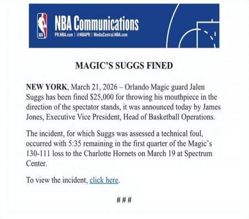 NBA官方还表示,魔术队后卫萨格斯因朝着观众席扔牙套被罚款25000美元。