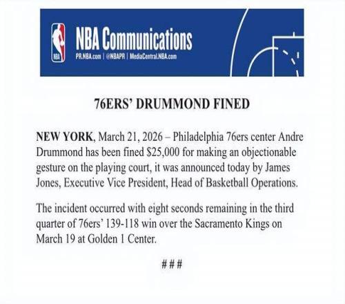 NBA官方表示,76人队中锋德拉蒙德因在场上做出不雅手势,被罚款25000美元。NBA篮球运营执行副总裁詹姆斯-琼斯公布了这一处罚决定。该事件发生在周五76人队客场以139比118战胜国王队的比赛中,第三节还剩8秒时。